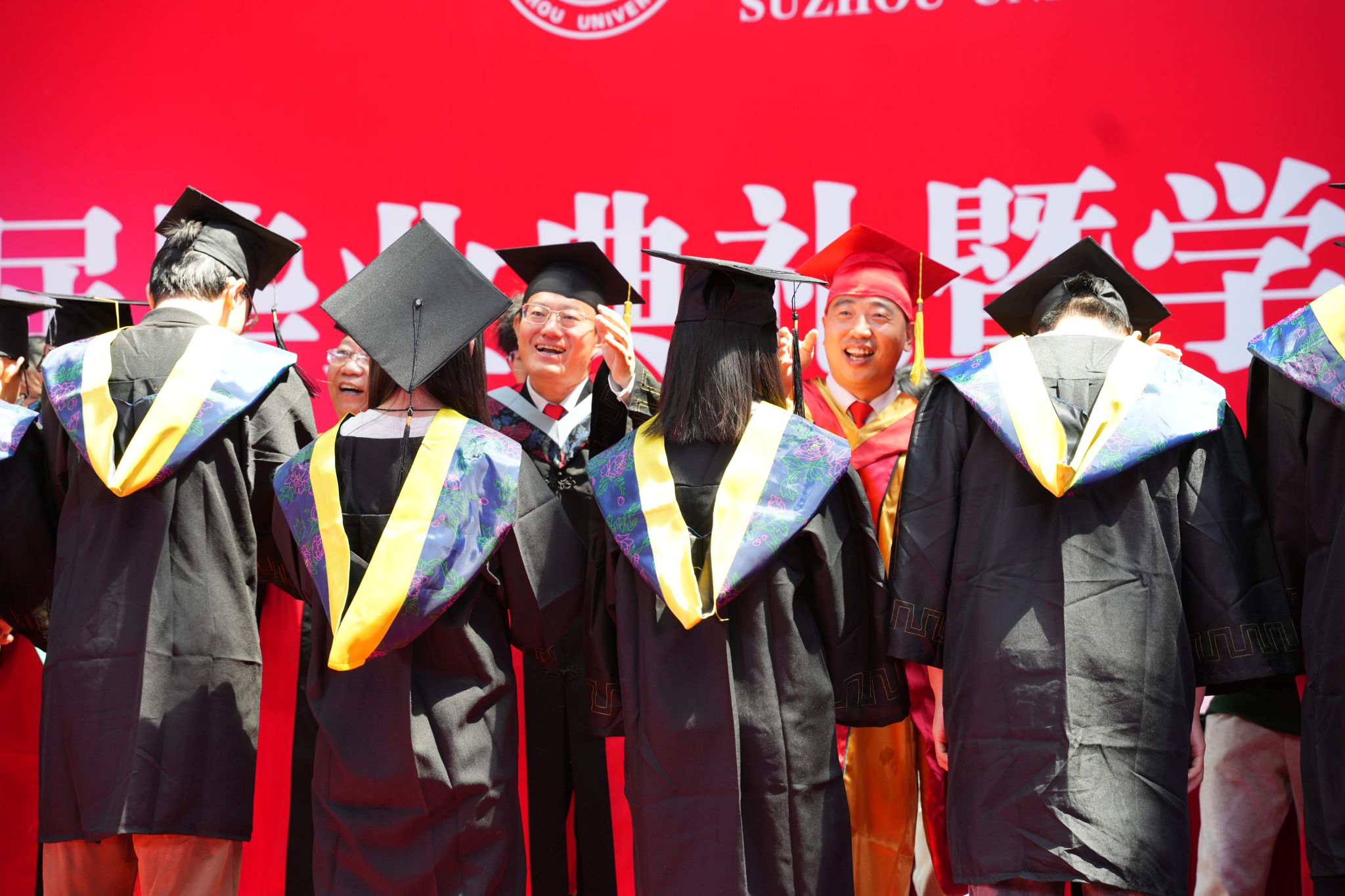 校领导、学位评定委员会成员为获得学士学位的毕业生代表扶正流苏、颁发学位证书。